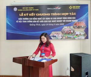 Tại buổi lễ, Cô Nguyễn Thị Hoài – Hiệu trưởng nhà trường đại diện nhà trường đã ký kết hợp tác với Sun Group vùng Đông bắc về việc tăng cường gắn kết giữa giáo dục nghề nghiệp với doanh nghiệp về công tác thực tập của học sinh, sinh viên; tạo nguồn nhân sự chất lượng cao; tạo cơ hội việc làm cho học sinh – sinh viên khi ra trường; chuyên gia đào tạo là những người lao động có kỹ năng nghề nghiệp và kiến thức chuyên môn tốt.