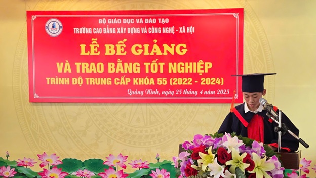 Đại diện cho học sinh tốt nghiệp Khóa 55, học sinh Vũ Văn Thanh Lớp 22TCA – ĐN1; nghề Điện – nước có những chia sẻ, bày tỏ lòng cảm ơn sâu sắc đến Lãnh đạo Nhà trường; tập thể thầy, cô giáo và hứa sau này trên con đường sự nghiệp, dù gặp bất cứ khó khăn nào, các em cũng sẽ khắc ghi những lời căn dặn, chỉ bảo của Thầy cô, luôn giữ vững lòng tin, tình yêu nghề, sẵn sàng mang sức trẻ và nhiệt huyết của mình, vận dụng sáng tạo những kiến thức đã học để cống hiến, góp phần xây dựng quê hương, đất nước và luôn tự hào là học sinh Trường Cao đẳng Xây dựng và Công nghệ – Xã hội.
