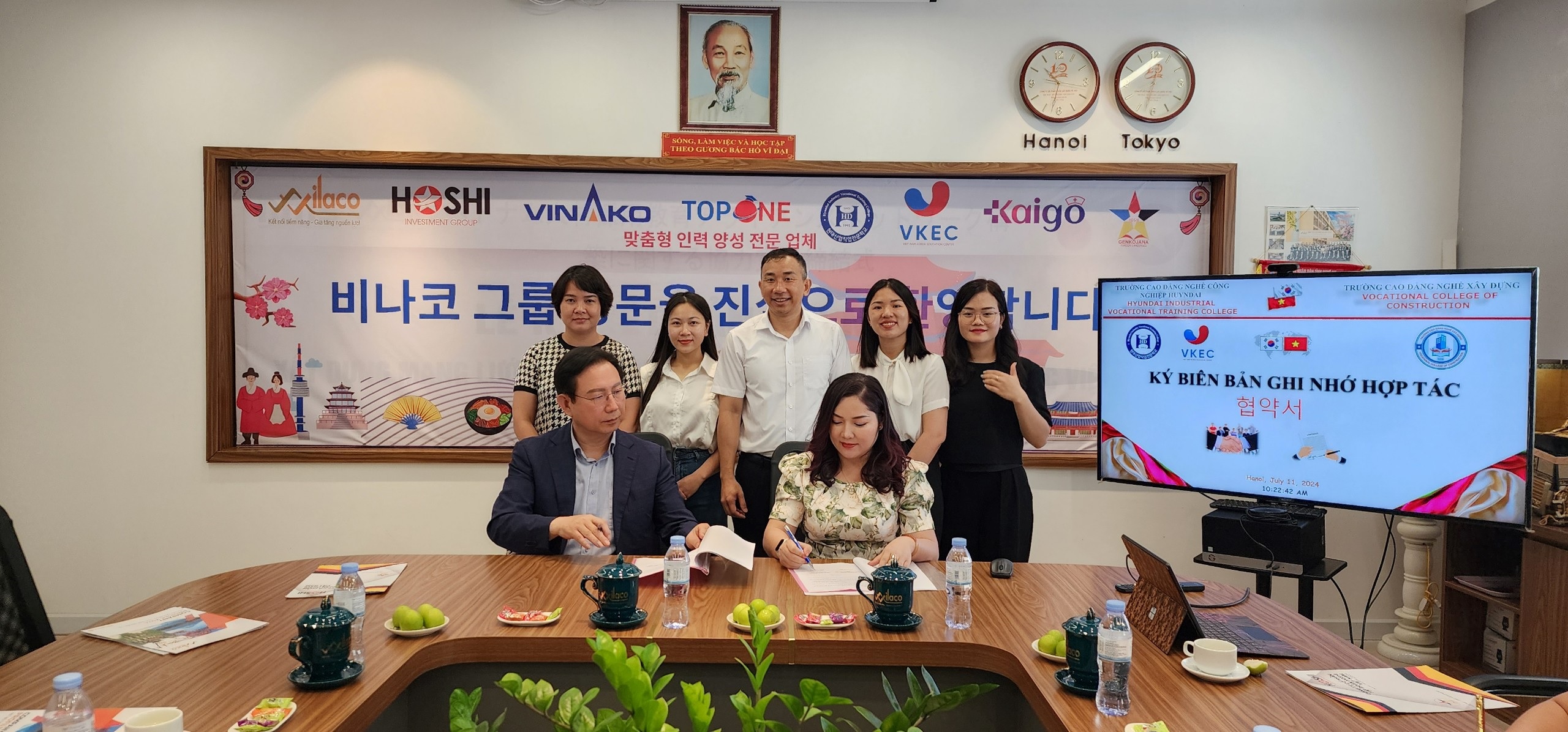 Ngày 11/07/2024, tại Công ty cổ phần tập đoàn Hoshi – Vilaco Việt Nam đã diễn ra buổi làm việc và ký kết thỏa thuận hợp tác giữa Trường Cao đẳng nghề Xây dựng (Việt Nam) và trường Cao đẳng nghề Huyndai (Hàn Quốc) về hợp tác đào tạo nghề chất lượng cao và đưa du học sinh sang Hàn Quốc học tập, làm việc. Nhằm mang tới cơ hội học tập, làm việc và định cư lâu dài trên đất nước Hàn Quốc cho các bạn học sinh, sinh viên Trường Cao đẳng nghề Xây dựng.