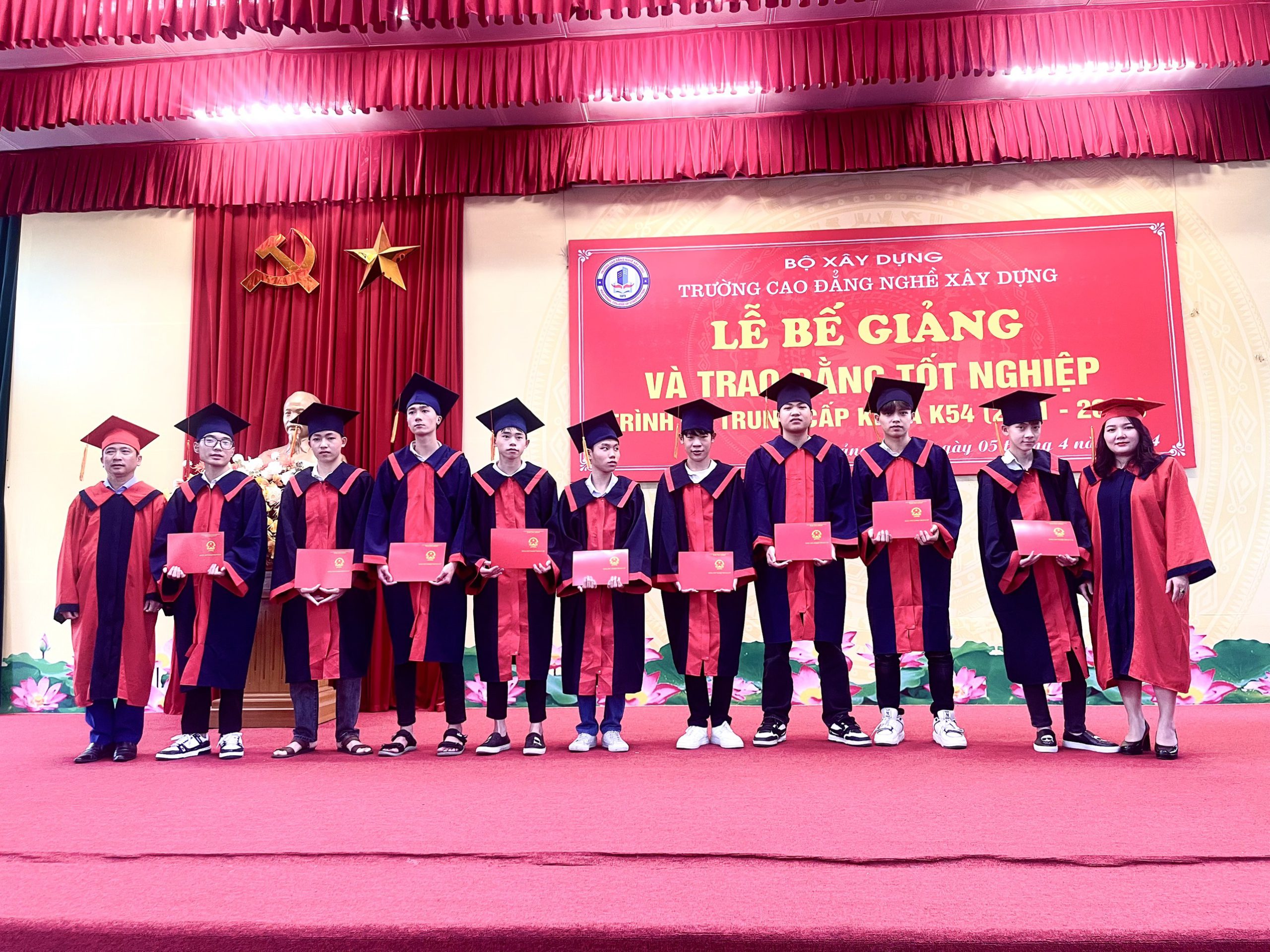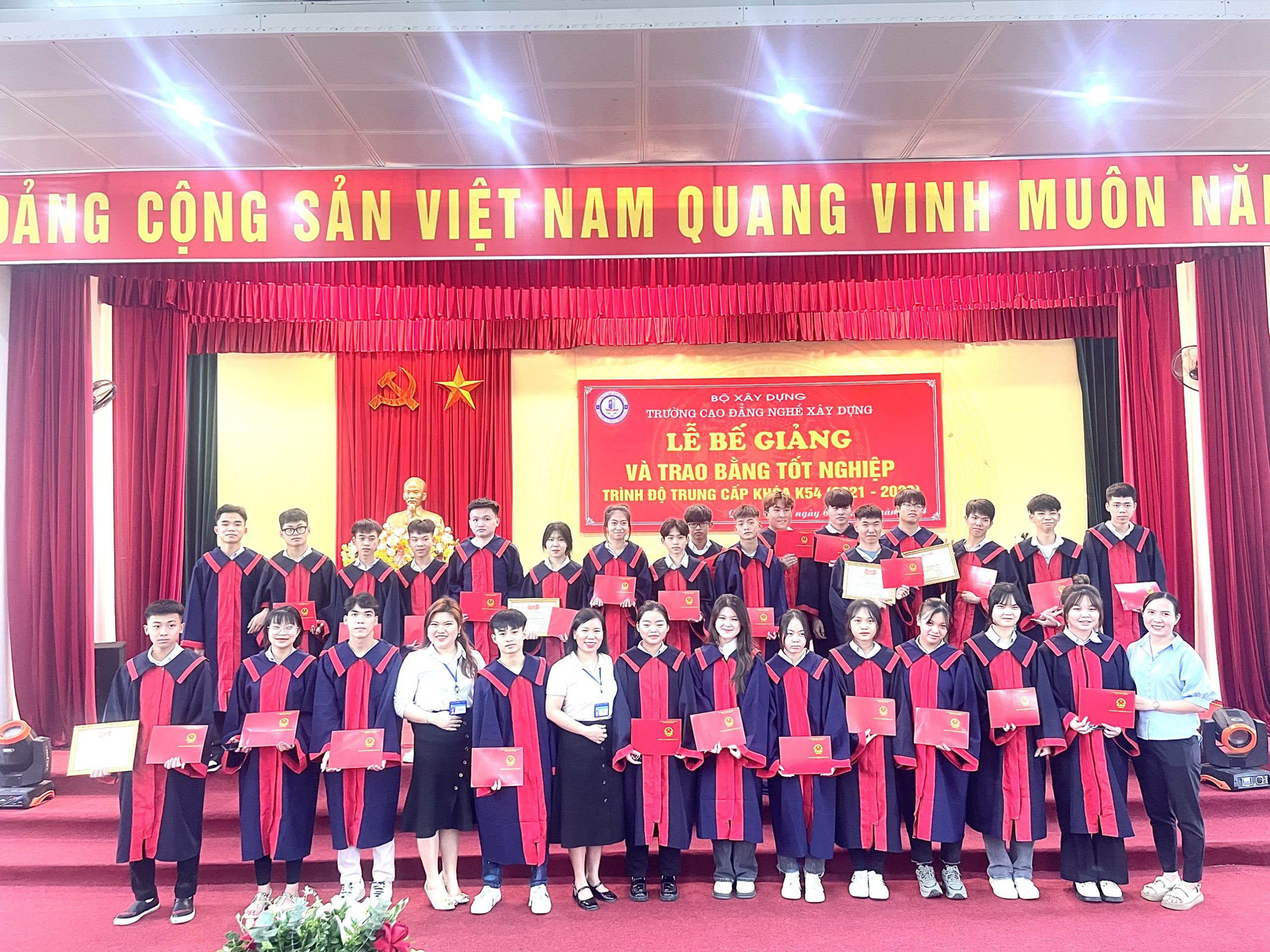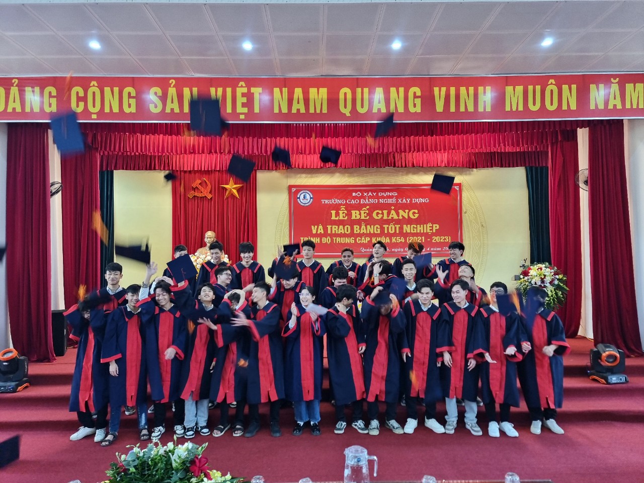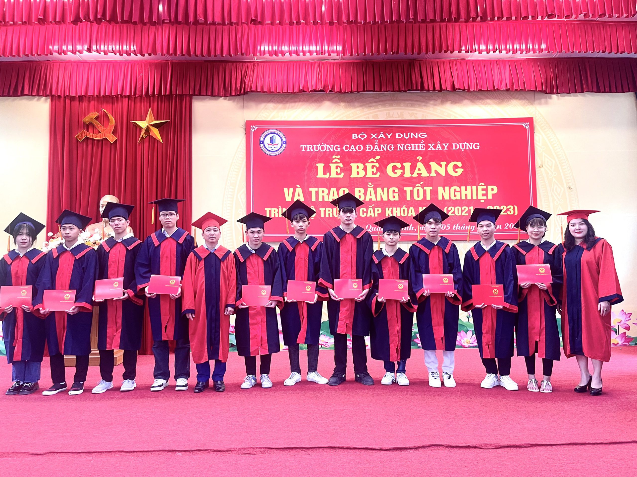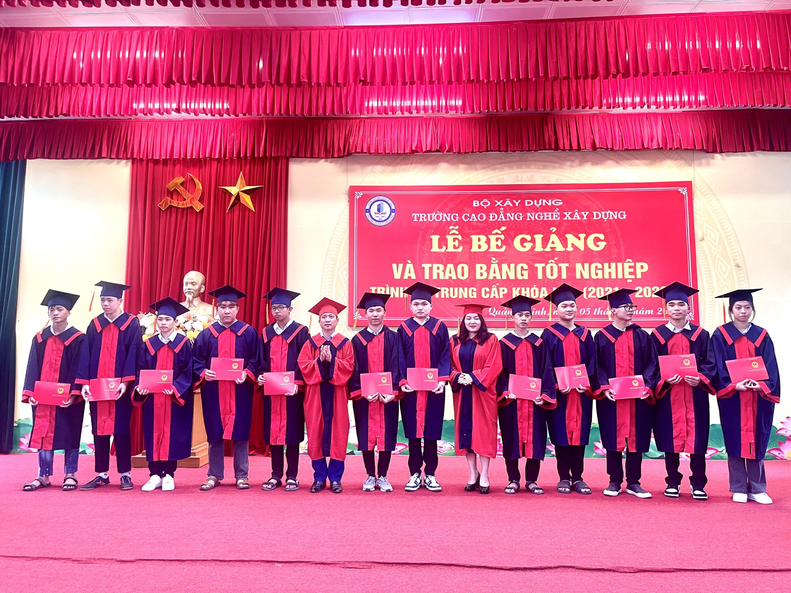 Đặc biệt, tham dự Lễ bế giảng và trao bằng tốt nghiệp có đông đủ học sinh trình độ Trung cấp các ngành như: Điện công nghiệp; Cấp thoát nước; Công nghệ thông tin; Kế toán doanh nghiệp; Kỹ thuật xây dựng; Điện – nước; Hàn; Kỹ thuật chế biến món ăn; May thời trang khoá 54 (2021 – 2023) được công nhận tốt nghiệp và nhận bằng tốt nghiệp trình độ Trung cấp của Trường Cao đẳng nghề Xây dựng.