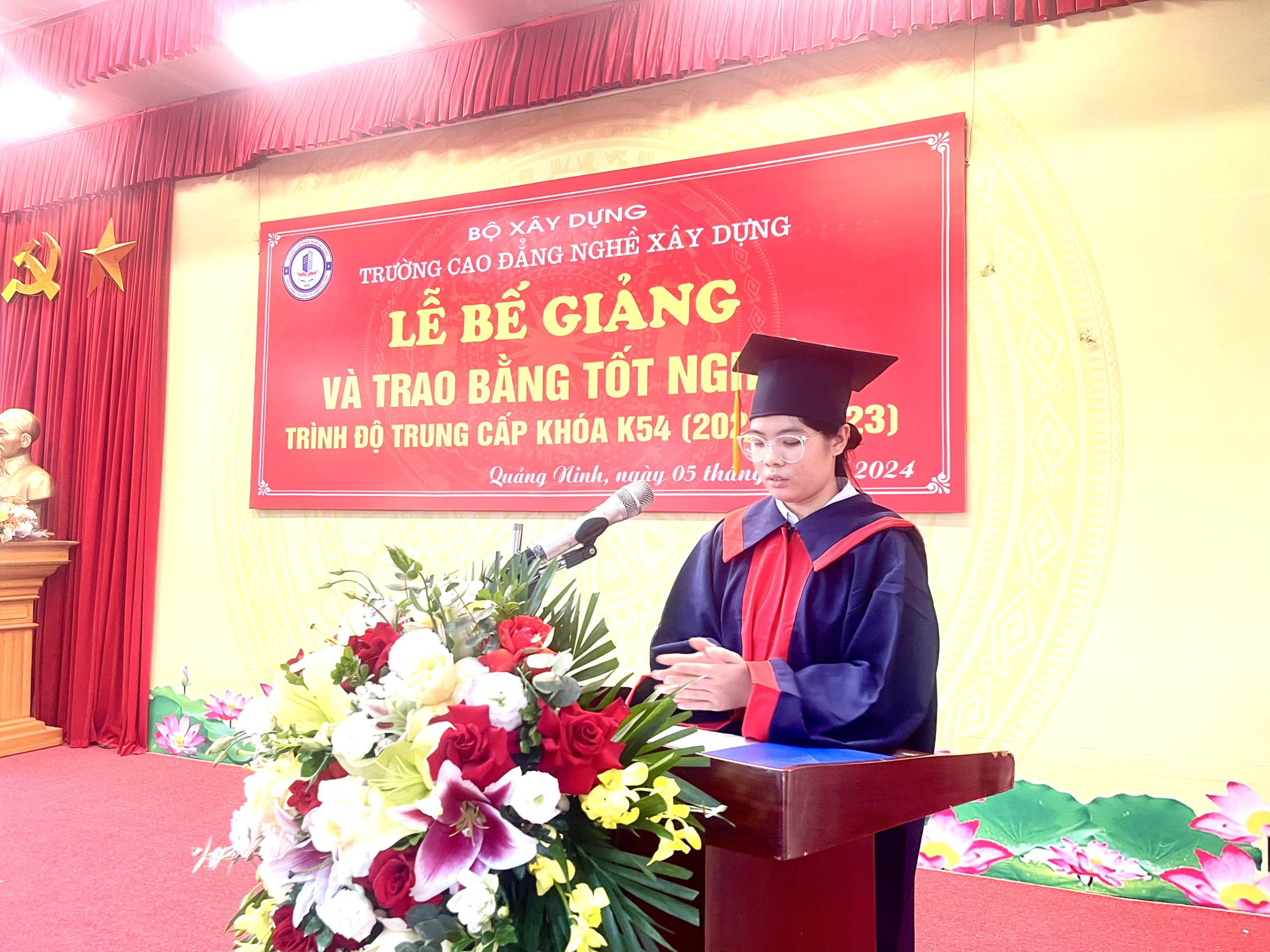 Học sinh Phạm Thuỳ Linh Lớp 21TCA – ĐCN – Nghề Điện công nghiệp, đại diện cho các bạn khoá 54 có những chia sẻ, bày tỏ lòng cảm ơn sâu sắc đối với sự quan tâm của Lãnh đạo Nhà trường, tập thể thầy cô giáo và bày tỏ những tình cảm của các em trong những ngày tháng học tập và rèn luyện tại trường Cao đẳng nghề Xây dựng. Đó là tình Thầy trò, nghĩa bạn bè, tinh thần hỗ trợ, đoàn kết, giúp đỡ lẫn nhau sẽ mãi còn đọng lại trong ký ức các em.