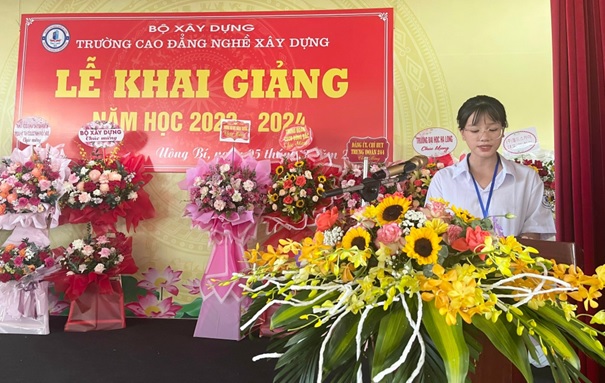 Trong không khí trang trọng của buổi lễ, đại diện tân học sinh, sinh viên năm học 2023 – 2024; học sinh Hoàng Thị Ngọc Trâm lớp nghề May Thời trang khoá 56 phát biểu bày tỏ niềm vinh dự và tự hào khi được học tập tại trường Cao đẳng nghề Xây dựng với bề dày 50 năm xây dựng và phát triển. Với niềm tự hào đó, em cũng như toàn thể học sinh, sinh viên nhà trường nguyện phấn đấu nỗ lực học tập và rèn luyện thật tốt để xứng đáng với truyền thống của Nhà trường.