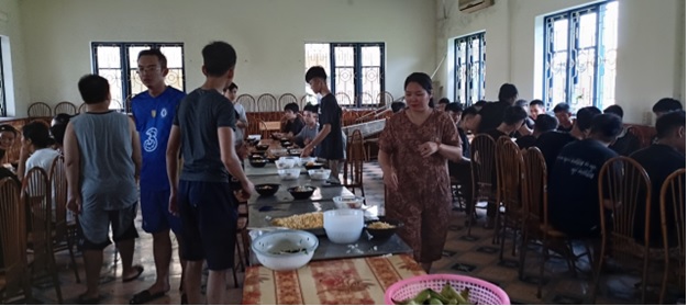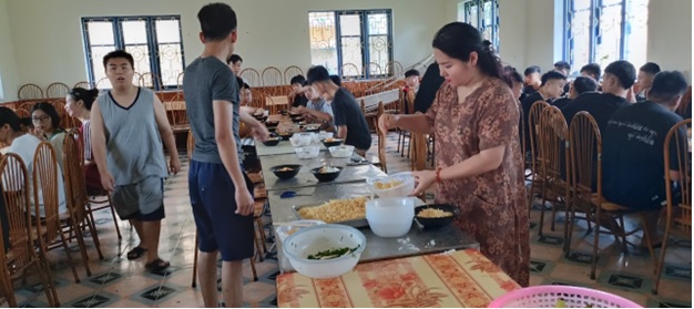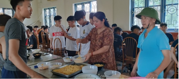 Ban giám hiệu và Thầy, cô giáo chuẩn bị bữa ăn cho các em trong những ngày mưa bão