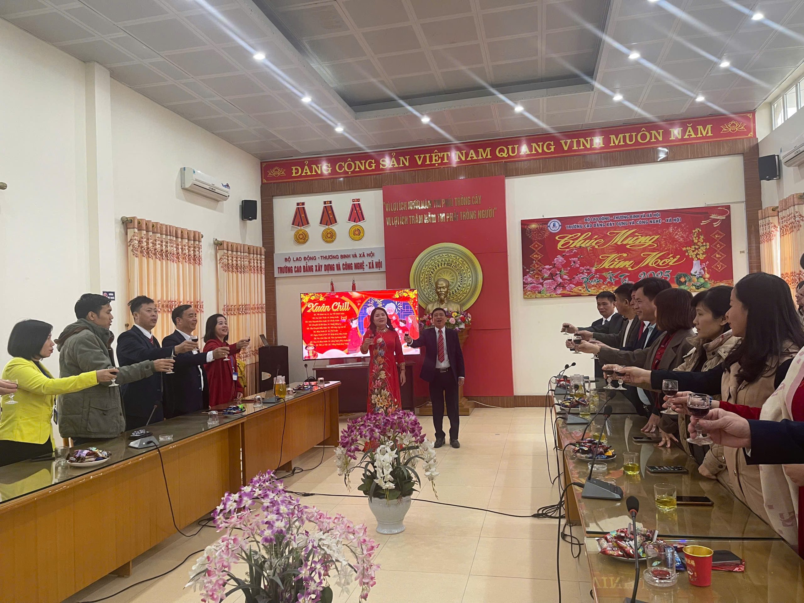 Chương trình gặp mặt đầu xuân và chúc mừng năm mới diễn ra trong không khí tưng bừng, ấm áp. Những lời ca tiếng hát, những ly rượu hồng, những nụ cười rạng rỡ cùng những lời chúc mừng tốt đẹp nhất báo hiệu sự khởi đầu một năm tràn đầy sức khỏe, thành công và hạnh phúc cho Đại gia đình Trường Cao đẳng Xây dựng và Công nghệ – xã hội.